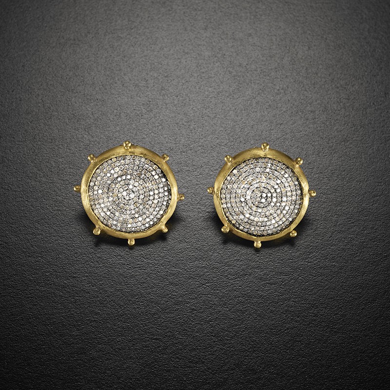 These circular pave’ Diamond earrings are as twinkling eyes in the clouds. Seen through the mists of layers of realities, they see all and hear all, while translating the Music of the Spheres just for your ears. Listen…and awaken to your own music…Hear…and they will open the doors to your own Joy and Beauty.